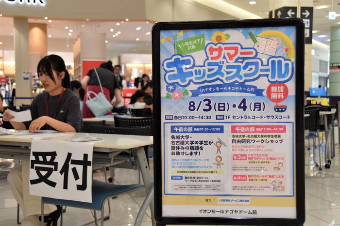 人間学部髙橋香苗ゼミの学生を中心に人間学部の有志の学生21名が8月3日・4日、イオンモールナゴヤドーム前店で地域の小学生以下を対象に、午前に夏休みの宿題のサポートを、午後には自由研究に役立つワークショップのイベント「サマーキッズスクール」を開催しました。昨年に続く夏休みの子供たちの学習サポートのイベントで、8月3日には名古屋大学経済学部の土井康裕教授のゼミ生と講義受講生の11人も宿題サポートとワークショップを行いました。8月3日にはマスコミが取材に入り、2日間で延べ95人の子供たちが参加し、賑わいを見せました。