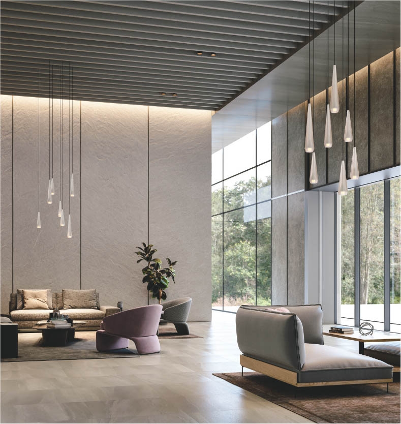 無垢のアクリル素材を削り出し、透明消し仕上げを施した上質感のあるセードが、控えめで美しい光を演出するペンダントライトを4機種拡充しました。昼間のやわらかな自然光の中で消灯している際には、まるでガラスのような透明感を感じさせるアクリルセードが空間に静かに存在し、穏やかで控えめな「クワイエット・ラグジュアリー」な空間に調和するデザインが特長です。