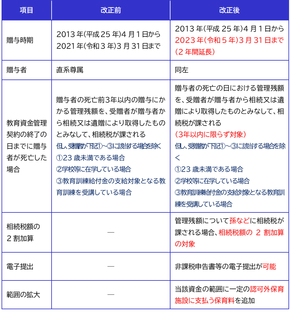 当該措置は、贈与を受ける人一人当たり1,500万円まで(学校等以外の者に支払われる金銭については 500 万円まで)の教育資金が非課税になる制度ですが、改正概要と適用時期は以下のとおりです。