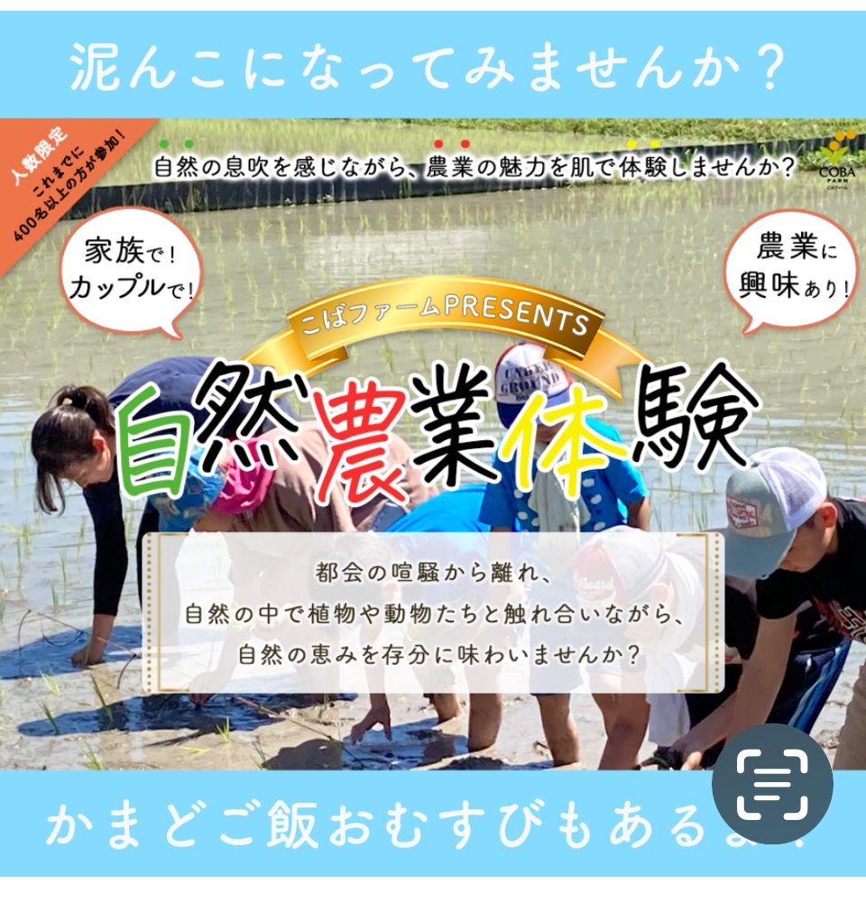 様々なものが効率化やデジタル化・グローバル化など目まぐるしく変化し、それに適応することが求められる現代において、今回、私どもの提供させていただく『自然農業体験』を通して、大自然の温かさや優しさ、多くの命で輝いている田んぼや畑に触れ「本当の豊かさは何なのか!」ということを五感で感じてもらいたいです。そして、田植えの後はとても美味しい“かまどのおむすび”を皆様で握って頬張っていただき、元気で笑顔になっていただきたいと切に願っております。そして、「よしっ!明日からまた頑張ろう!」という気持ちになってこばファームの田んぼから出発していただきたいと願います!