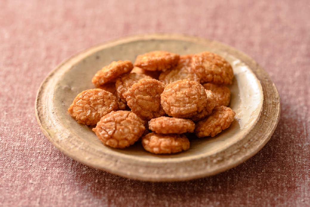 日本のおいしい「お米」と「水」と「素材」を使い、手間・ひまかけて作り上げるみりん揚げをコンセプトに開発いたしました。全国酒類品評会で名誉賞を獲得した本みりん「九重櫻」をはじめ、国産のうるち米、しょうゆなど厳選した素材を使った上品なおやつです。