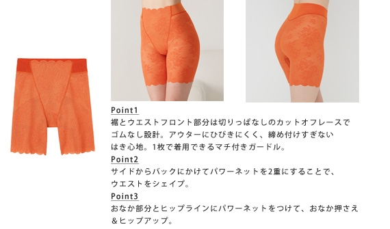 カップ付きキャミソールはウエスト部分のシェイプを強めに設計、ショーツとロングガードルもウエスト部分のパワー