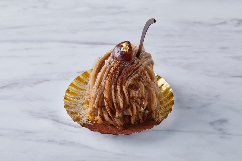 <内容>マロンクリームの中にヘーゼルナッツメレンゲ、チョコムース、生クリーム、栗の渋皮煮クラッシュを重ねました。マロンクリームにはこしあんを加えた事でコクを引き出しています。グランドメニューのモンブランとはまた異なる、秋限定のモンブランです。