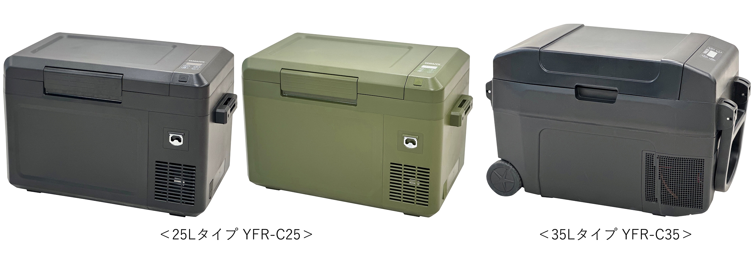 今回の冷凍冷蔵庫は、コンプレッサー式を採用。食材に合わせて-18~10度で温度を設定できるので、冷蔵庫としても冷凍庫としても使用でき、夏場などの暑さによる食材の傷みも心配いりません。また、家庭用の交流(AC)100Vのコンセントや車のシガーソケット(DC・12V/24V)に対応しているので、自動車でのお出かけや買い物など、様々なシーンで活用できます。容量は25L・35Lの2サイズ展開で、どちらも持ち運び可能です。