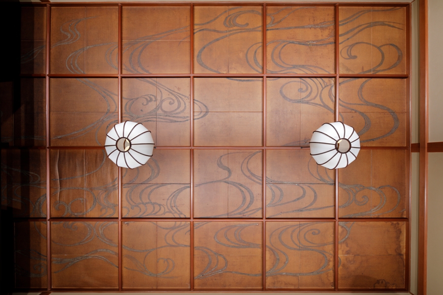 現在の天井には、「中村松月堂」の扇子職人 14代 中村清兄により、火事よけのために波(水)の画が描かれています。
