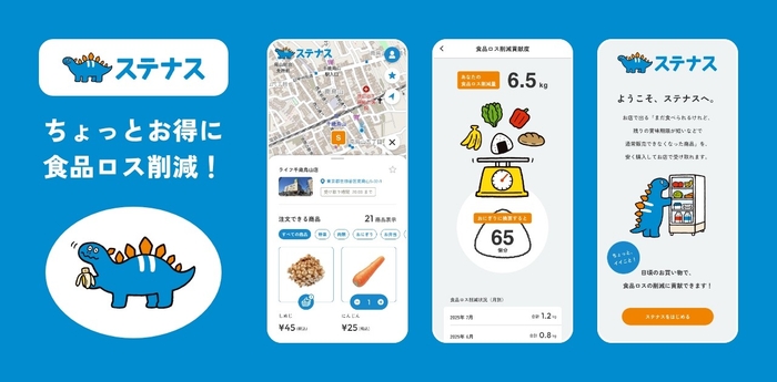 サービス名の「ステナス」は、「捨てない」と「サウルス」を掛け合わせた言葉です。親しみやすいキャラクターと共にこのサービスを身近に感じてもらい、気軽に食品ロス削減に参加してもらいたいという思いから命名しました。