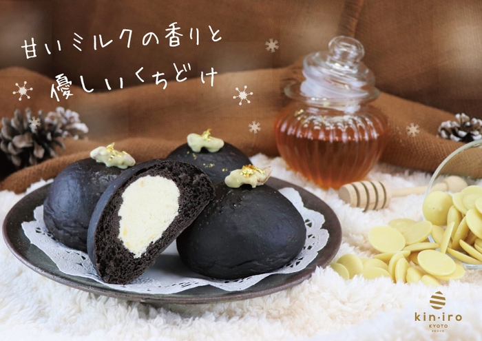 ブラックカカオで作った真っ黒でふわふわなパンに、真っ白で雪のようなクリームをたっぷり詰め込んだ、キンイロの冬の人気商品が再登場。中に入っているクリームは、スペイン産レモン蜂蜜で作ったすっきりした味わいのカスタードクリームに砕いたホワイトチョコレートを混ぜ、ミルクが香る優しい口どけに。パンの上には、金箔とホワイトチョココーティングしたクルミをアクセントにのせました。