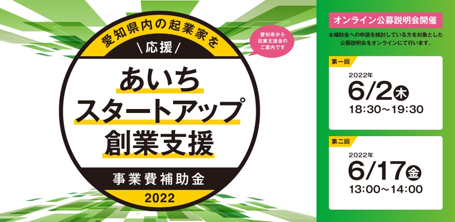 愛知県内の起業家を応援。「あいちスタートアップ創業支援事業費補助金(起業支援金)」の公募を、 6月1日(水)より開始。