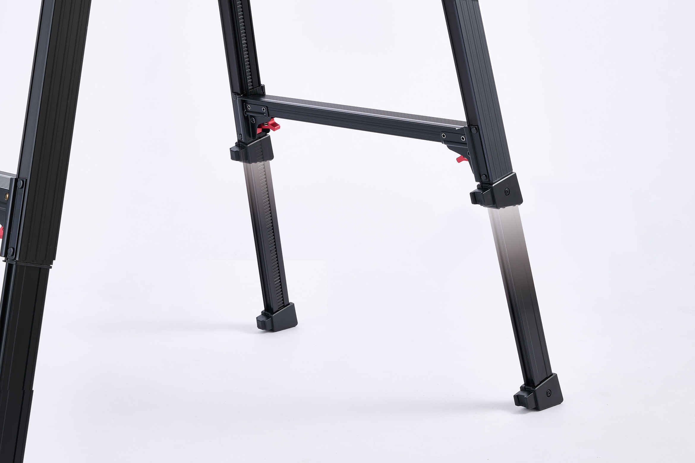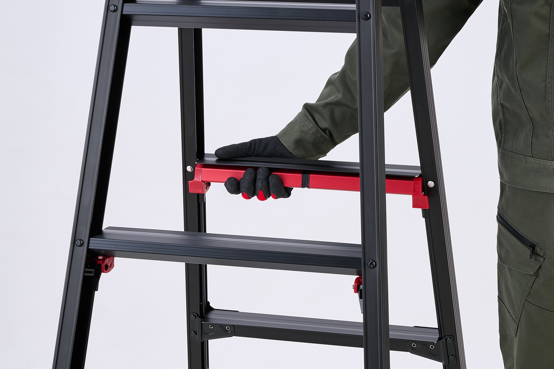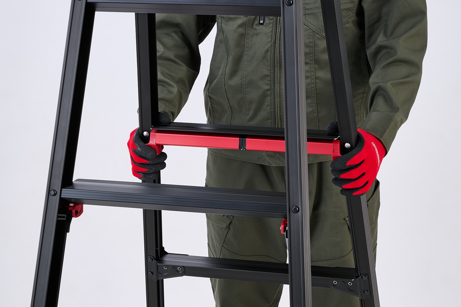 はしご時では、レバーを踏むことで伸縮脚が縮まないように、上部操作レバーをロックする安全構造になっているため、昇り降りの際も不安なくご使用いただける設計です。