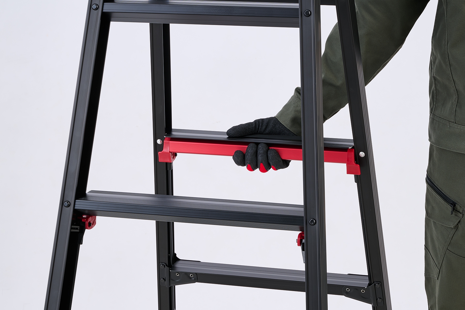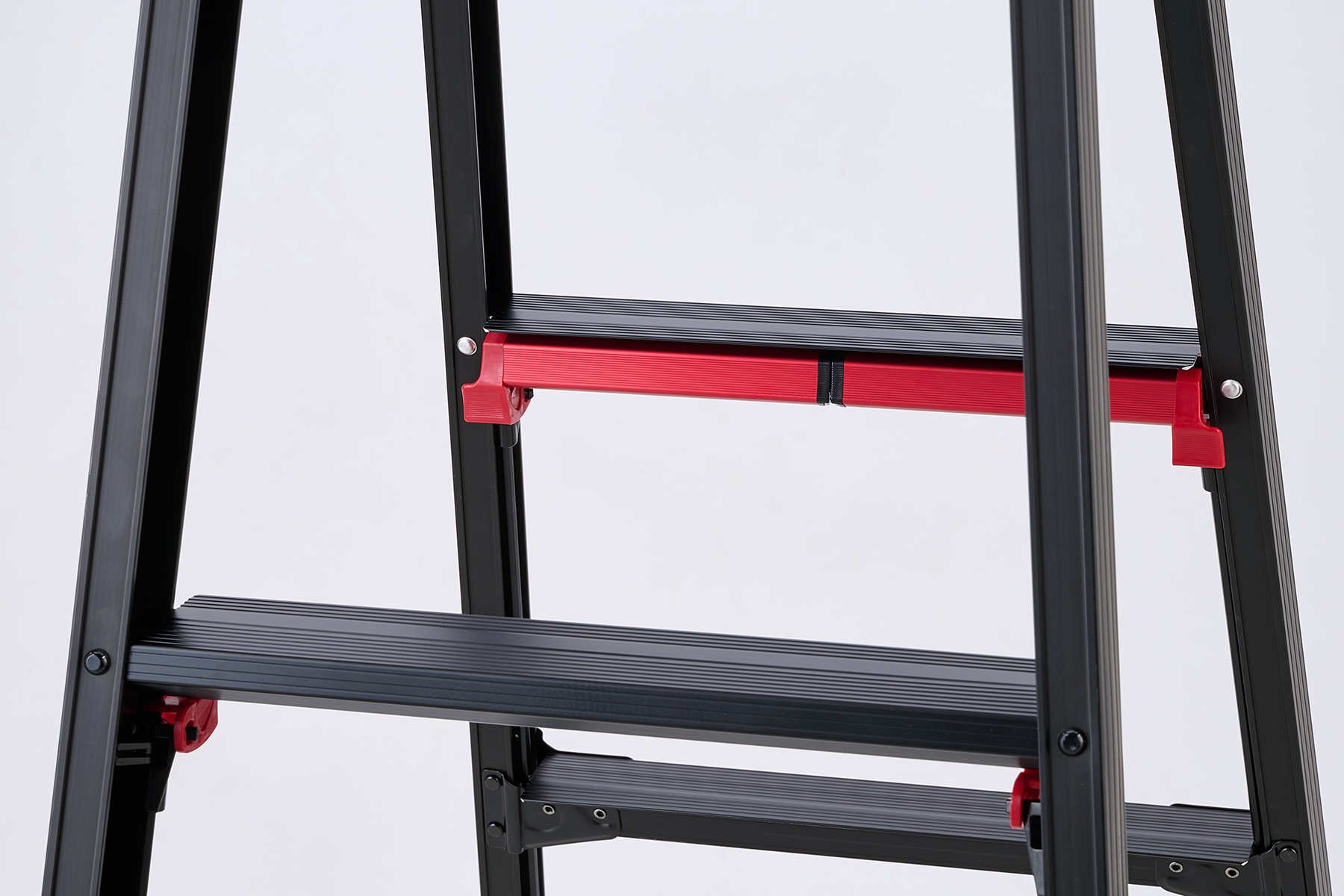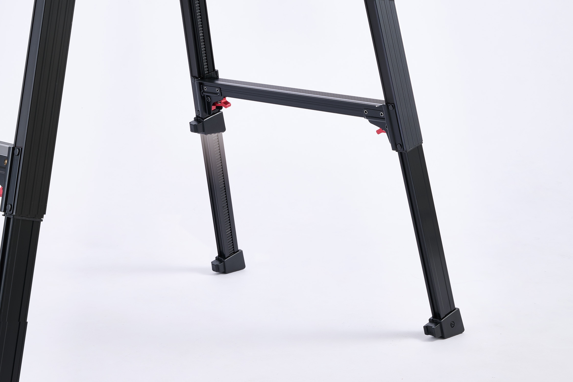 はしご時では、レバーを踏むことで伸縮脚が縮まないように、上部操作レバーをロックする安全構造になっているため、昇り降りの際も不安なくご使用いただける設計です。