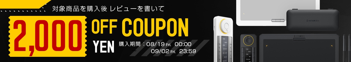 キャンペーン内容:ペンタブレット4機種をご購入の方の中から、お買い物いただいた商品に関するレビューをお送りいただくとXencelabs ヤフー店でお買物時に使える全品対象の「2,000円お値引きクーポン」をプレゼント
