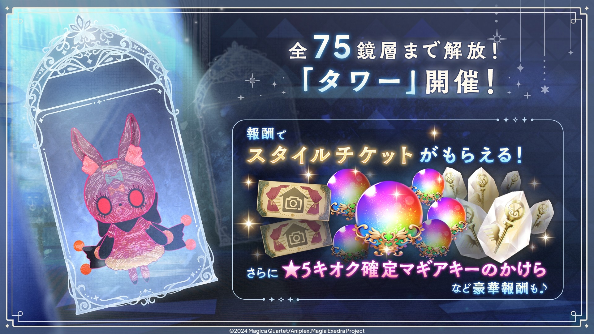 今回のタワーは全75鏡層までの解放となっており、クリアすることで「プリズムオーブ」を15個以上獲得することができます。さらに「★5キオク確定マギアキーのかけら」や、今回から新たに「スタイルチケット」も獲得いただけます。