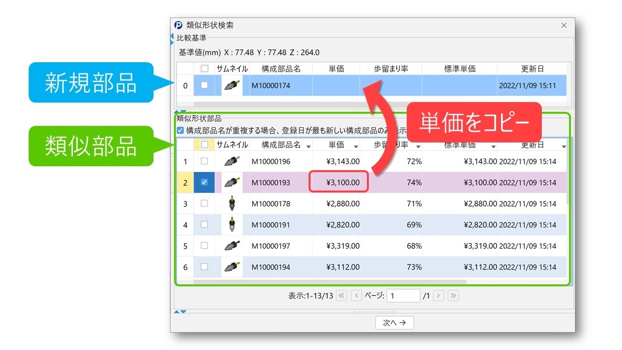また、部品の3D形状をキーにして類似部品を検索する機能により、新規部品に類似した既存部品が見つかった場合、そのコストを新規部品の見積原価として採用することができます。本機能による見積手法の標準化を図ることで、担当者ごとの結果の違いが無くなり、組織全体の見積精度向上につながります。