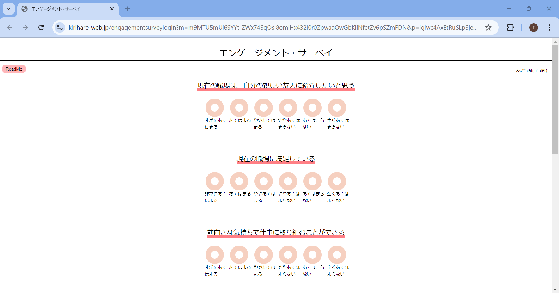臨床心理士と作ったキリハレ独自のサーベイが特徴です。一般的なエンゲージメントサーベイは、50~100問程度あり、回答に20~40分ほどかかります。また、1つの質問文に含まれる情報量が多く、文章を理解するのにも時間が必要です。