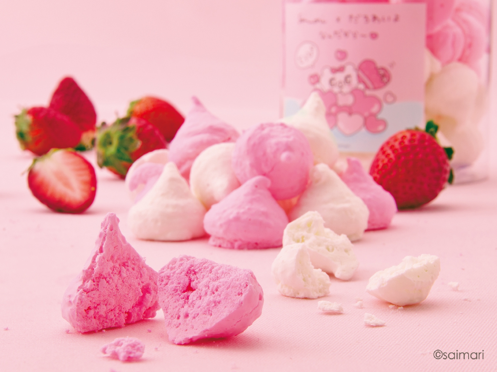 メレンゲでできたカラフルな「スフレ」を、クマ子デザインのパッケージに詰め合わせました。フレーバーは、ココナッツと苺の2種類が入っています。