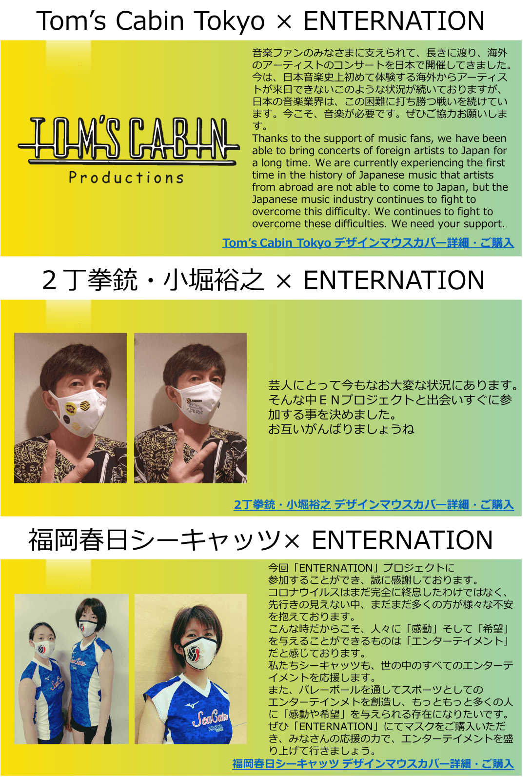 株式会社ハイウェイプラネットとハイファイブ株式会社(代表者:久島信耶/所在地:東京都千代田区)は、コロナ禍の中、エンタメ業界を応援するためのプロジェクト “ENTERNATION” を始動し、ウィズコロナ時代への感染予防啓発アイテムとしてコラボレーターとのコラボレーションマウスカバーを販売いたしました。