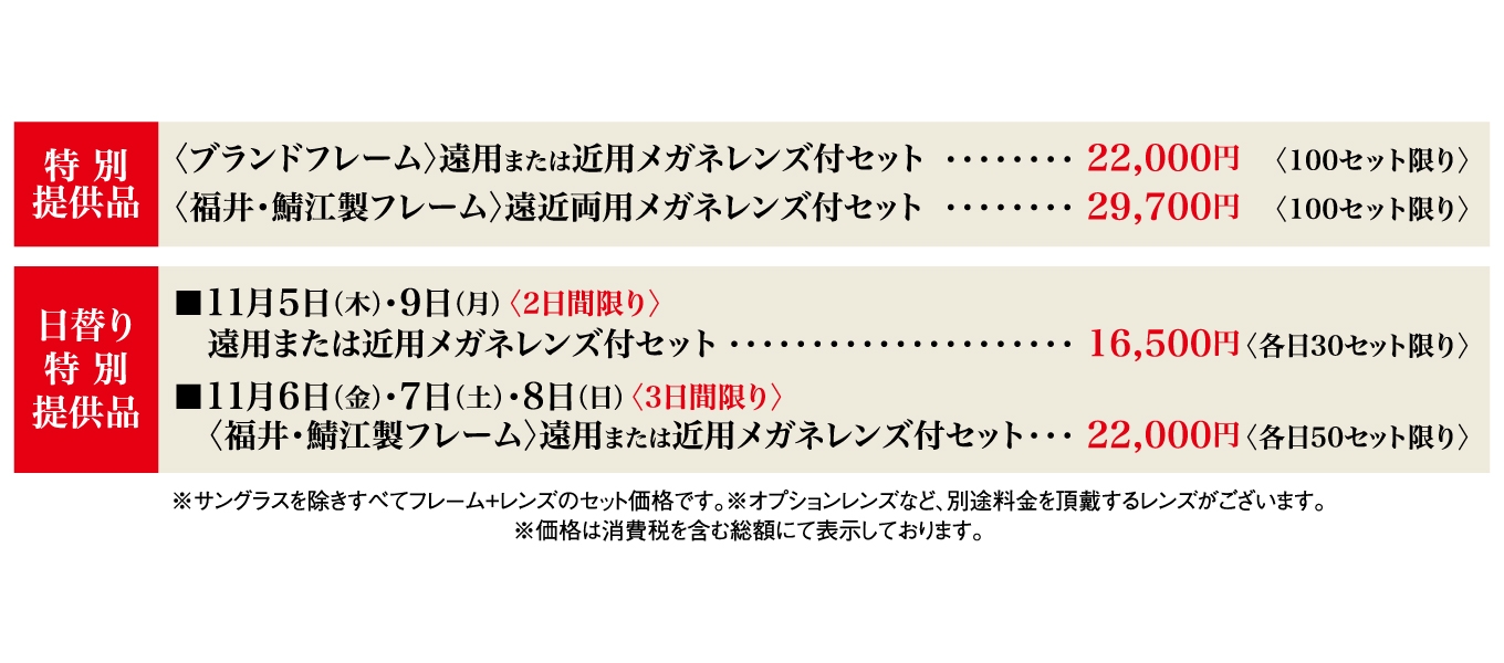 有名ブランドや福井・鯖江製フレーム+レンズセットを16,500円からご用意しております。期間限定のお買得なセットは、数に限りがございますのでお早目のご来店がおすすめです。