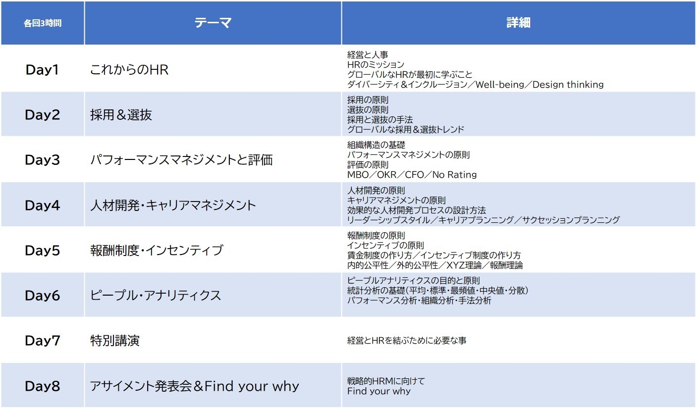 HRBP養成講座は、Day1からDay8までの8講座構成となっており、まず全体像を掴み、HRの各領域をテーマとした講義で理解を深め、特別講演で実践のヒントを得る構成となっています。
