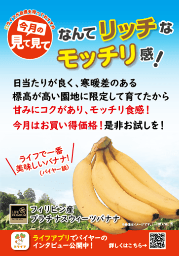 “おいしい” “ワクワク” “ハッピー” をお届けするライフコーポレーションは、素材・製法にこだわりおいしさを追求したプライベートブランド“ライフプレミアム”より「フィリピン産プラチナスウィーツバナナ」を首都圏店舗で販売しております。