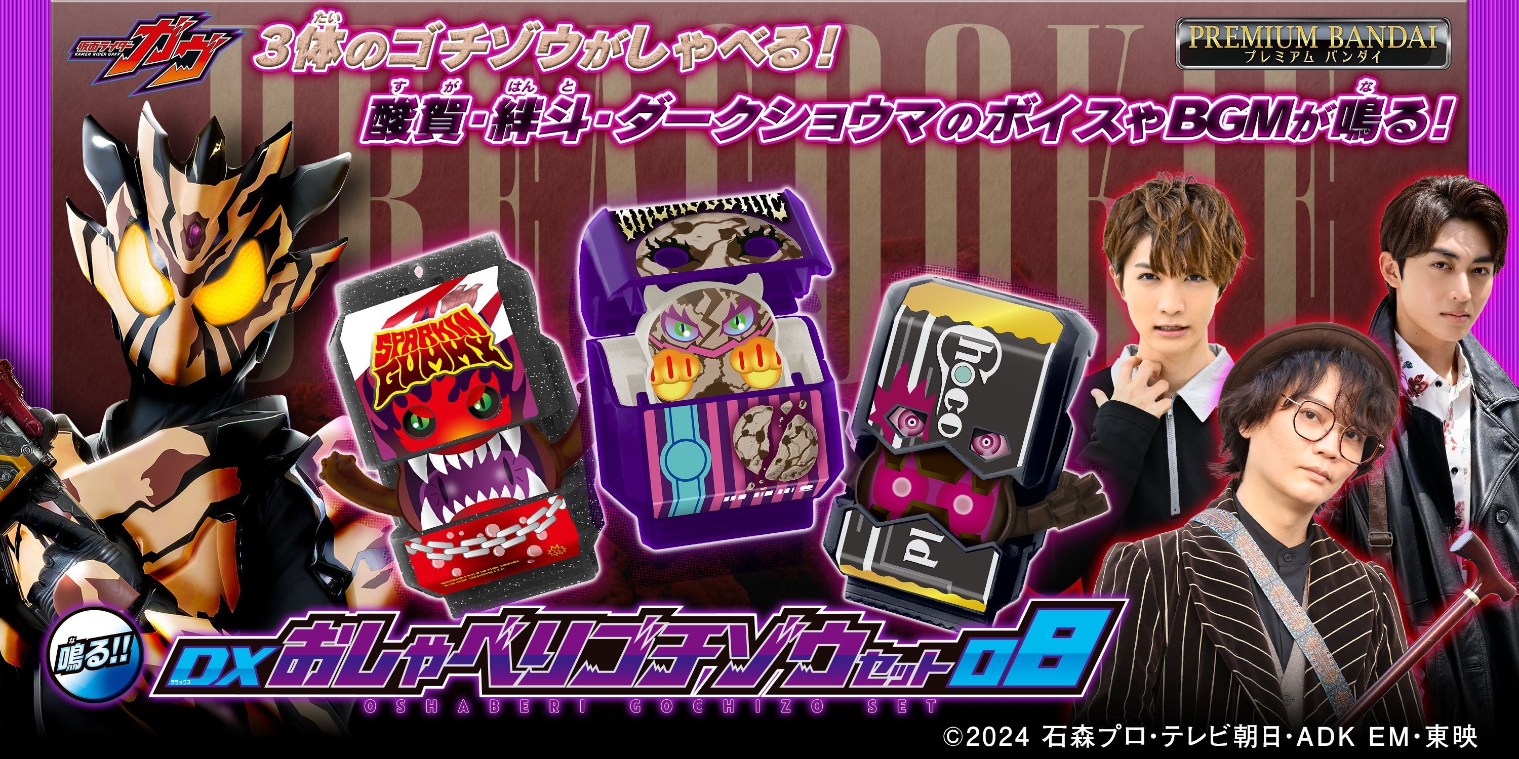 『仮面ライダーガヴ』より、「DXおしゃべりゴチゾウ」シリーズの最新作として、「DXおしゃべりゴチゾウセット08」を商品化いたします。本商品には、仮面ライダービターガヴ スパーキングミフォームの変身に使用する「スパーキングミゴチゾウ」、仮面ライダーヴァレン チョコルドフォームの変身に使用する「チョコルドゴチゾウ」、そして仮面ライダーベイク ブレイクッキーフォームの変身に使用する「ブレイクッキーゴチゾウ」の3種を収録。通常DX版のライダーゴチゾウシリーズから全パーツを新規造形することで音声ユニットを搭載し、様々な音声が発動可能となりました。