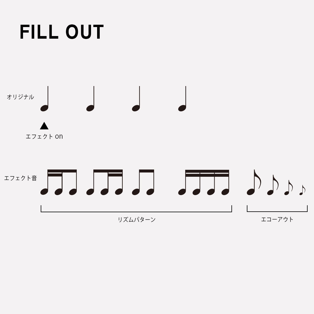 ・FILL OUTリズムパターンを変化させたROLLを形成し、ECHOでフェードアウトするエフェクト。