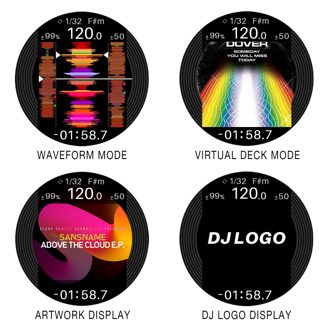 アナログターンテーブルの操作感で演奏ができる7インチのモーター駆動のVINYLIZED JOGは、お好みに合わせてトルクを調整することが可能です。また、スリップシートもお好みのものに交換することができ、最適なチューニングが施されたアクリルのトッププレートはより快適なスクラッチ操作を実現します。さらに、各ジョグに搭載された3.5インチON JOG DISPLAYは、パフォーマンス中にどの角度からでも波形情報、HOT CUEや楽曲再生位置を確認することができる設計となっており、モード設定によってさまざまな楽曲情報を表示させることができます。