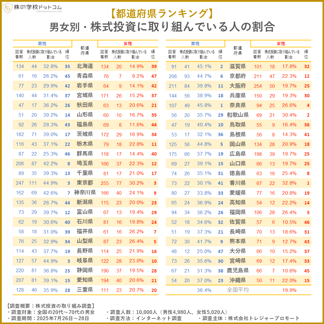 株式投資に取り組んでいると回答した人の割合を男女別に見てみると、全国平均では、男性が36.4%だったのに対して女性はわずか19.9%で、男性の半数近くに留まるという結果になりました。