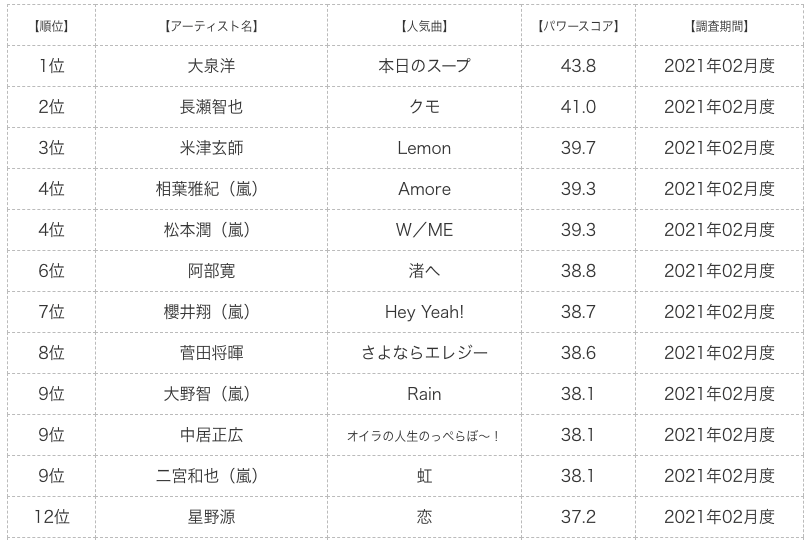 現在はアーティストとしてではなく、俳優としても活躍する大泉洋や嵐のメンバーもランクインしています。