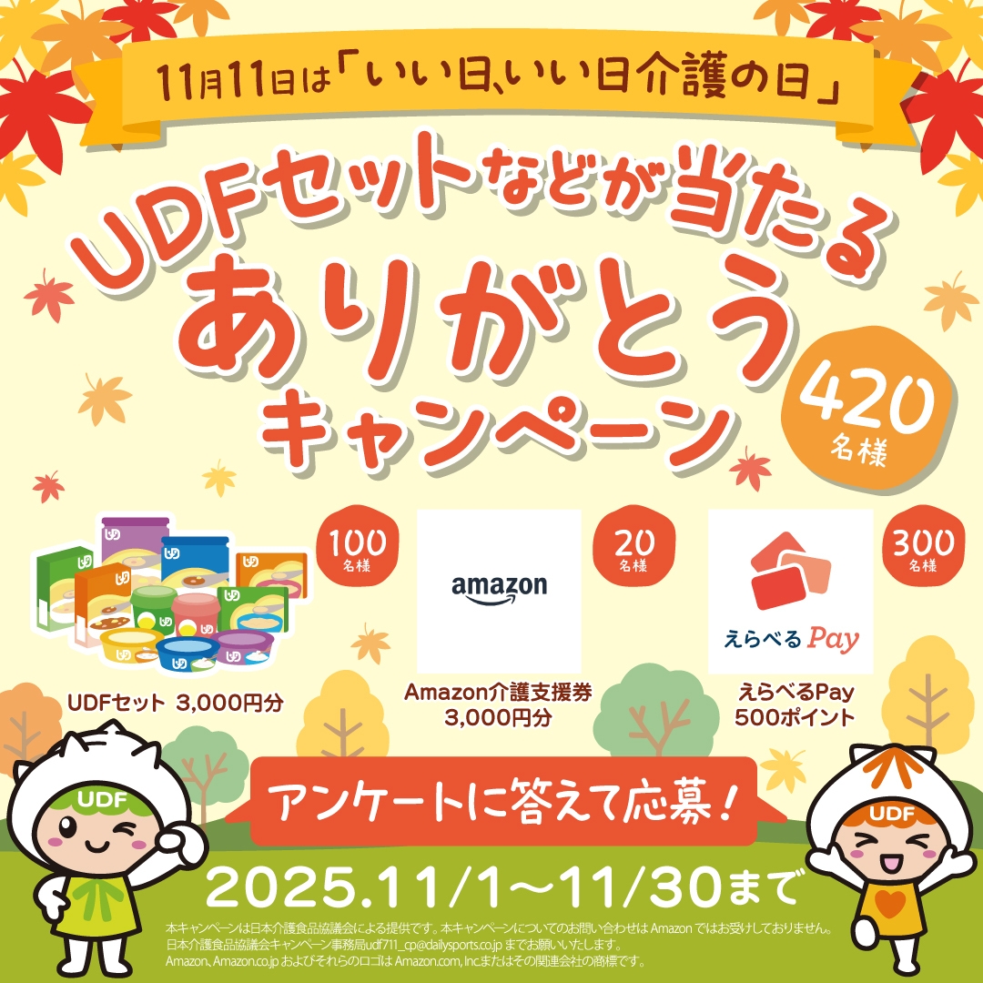 11月11日は、厚生労働省が制定した「介護の日」です。高齢化の進展に伴い、食べやすくおいしい介護食品への関心が高まる中、この「介護の日」に合わせて、家族で介護について考えるとともに、ユニバーサルデザインフード(UDF)を多くの方に知っていただく機会になるよう、UDFセット3,000円分や、「えらべるPay(R)」500ポイントなど合計420名様に抽選でプレゼントします。