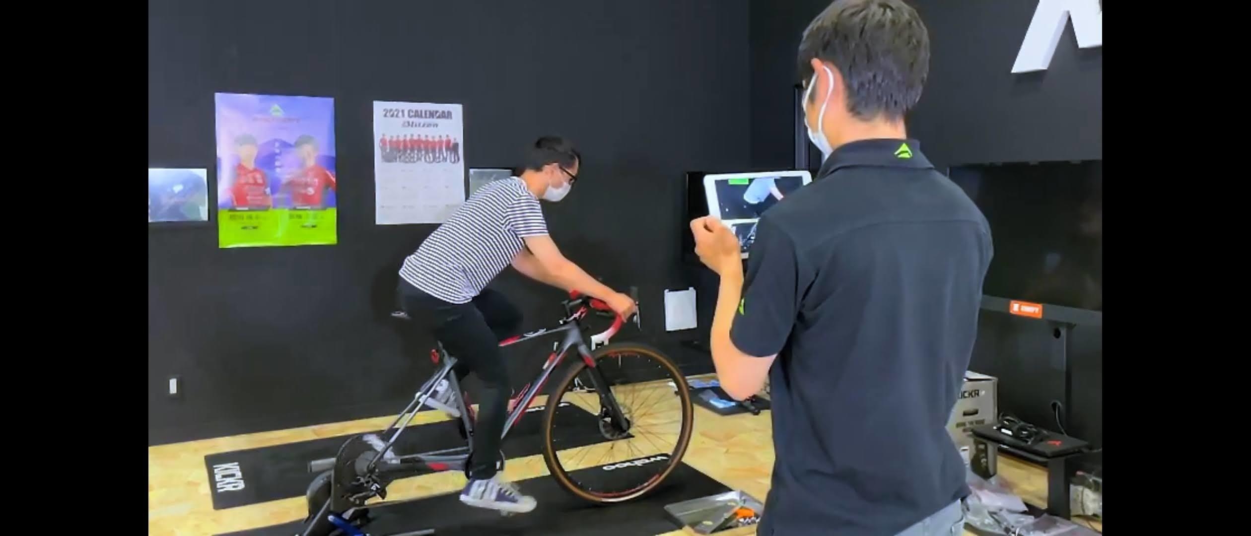 施設内にある固定ローラー台に受講者のロードバイクをセットして乗車姿勢や、ペダリングをチェック。動画で撮影することで受講者も客観的に確認することが出来るため、理解度が向上します。