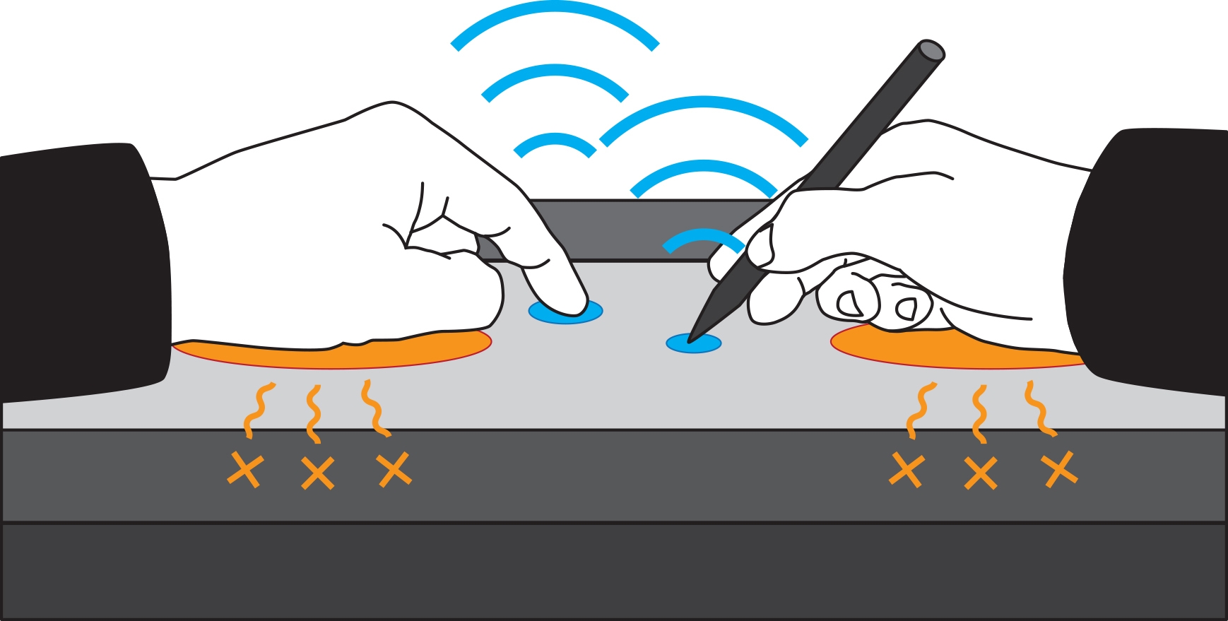指やペン以外の接触面でのタッチ動作を無効化し、手の側面がタッチパネルに触れた状態で操作する場合において誤入力を防ぎます。