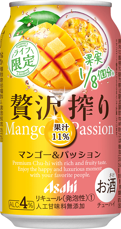7~8月が旬のマンゴー果実1/8個分の果汁11%とパッションフルーツのリキュールを使用し、熟したマンゴーをそのまま搾ったような味わいと香りに、爽やかな風味を加えました。