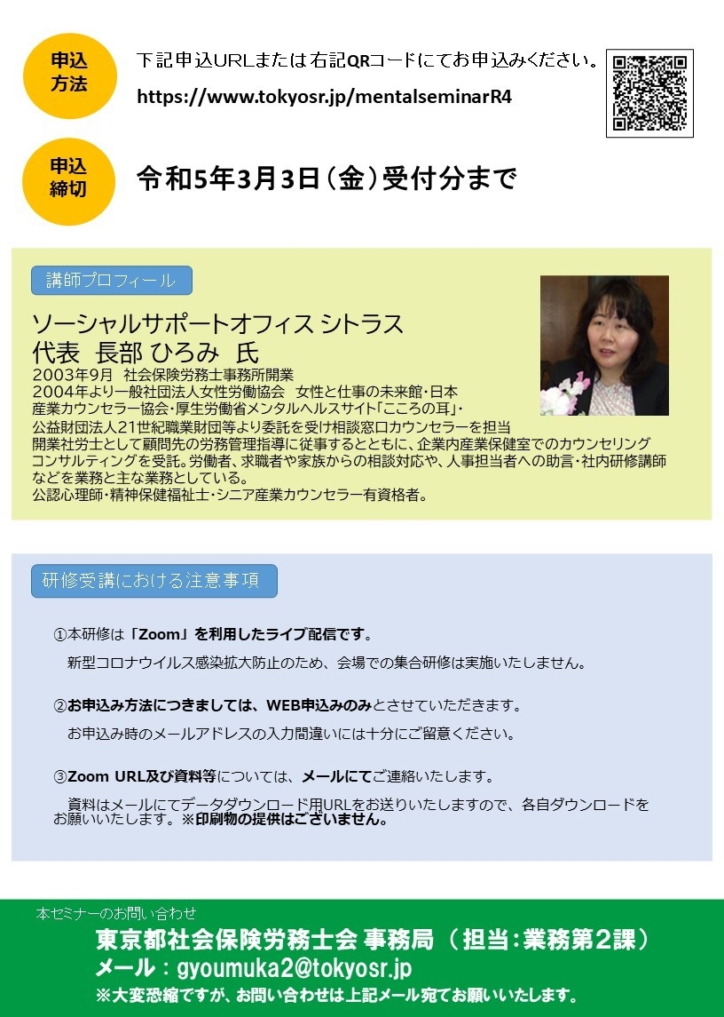 東京都社会保険労務士会(会長:寺田 晃)は、令和5年3月7日(火)15時~17時に「令和4年度メンタルヘルス対策セミナー」をオンラインで開催します。