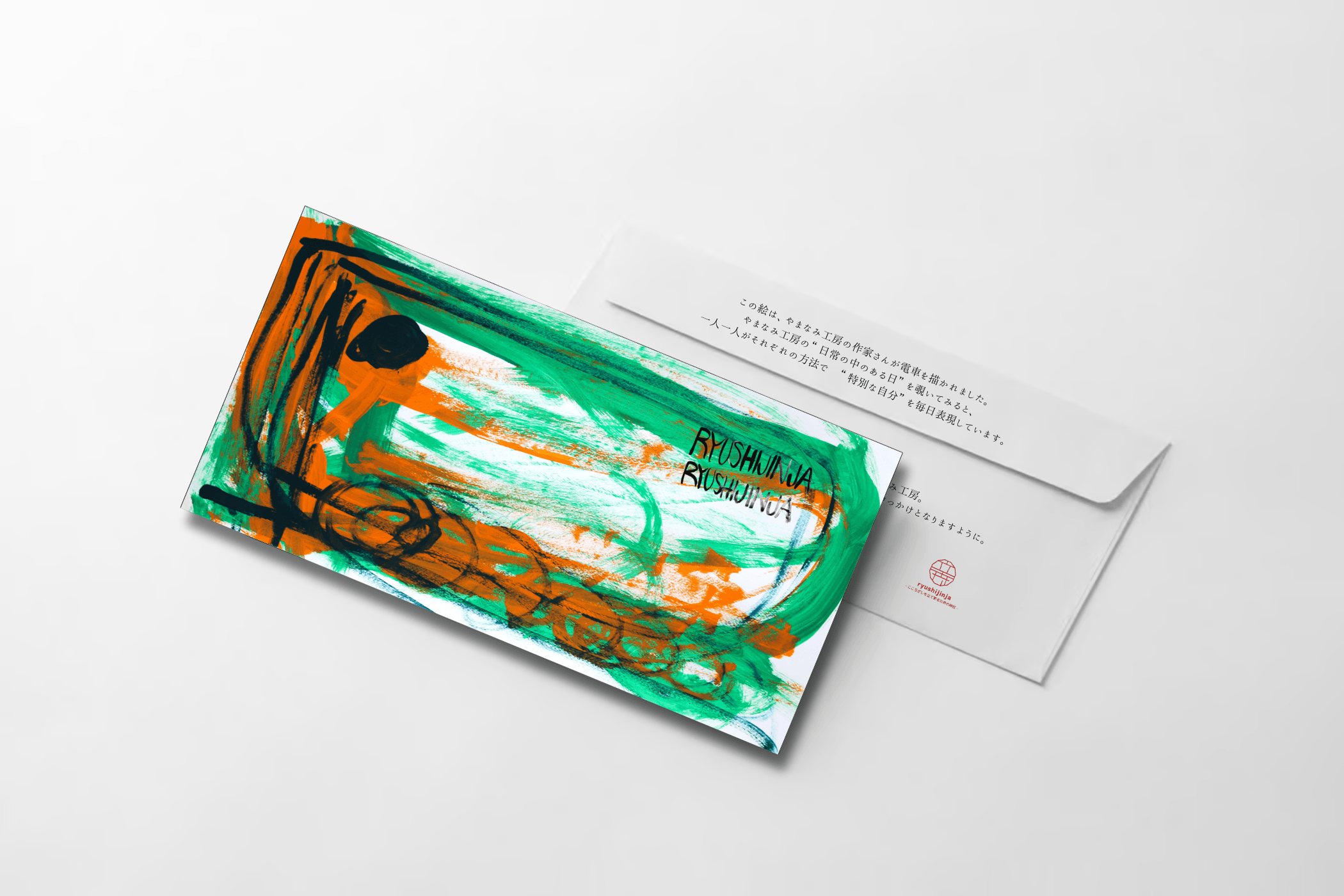 封筒のフタ部分には、やまなみ工房が大切にしている「日常の中にある、特別な自分」を表現。背面には、今ある豊かさに気づき、多様性を尊重する精神性を踏まえた「地域共生」のメッセージを記載。アートと価値観を併せて手元に残せるデザインとし、日常の中でふと地域を思い出す機会をつくります。