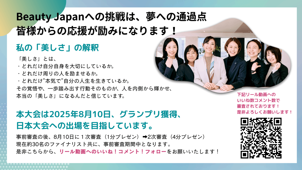 この度、”ビューティジャパン東京”というコンテストのファイナリストに選出いただき、8月の本大会に向け活動しています!