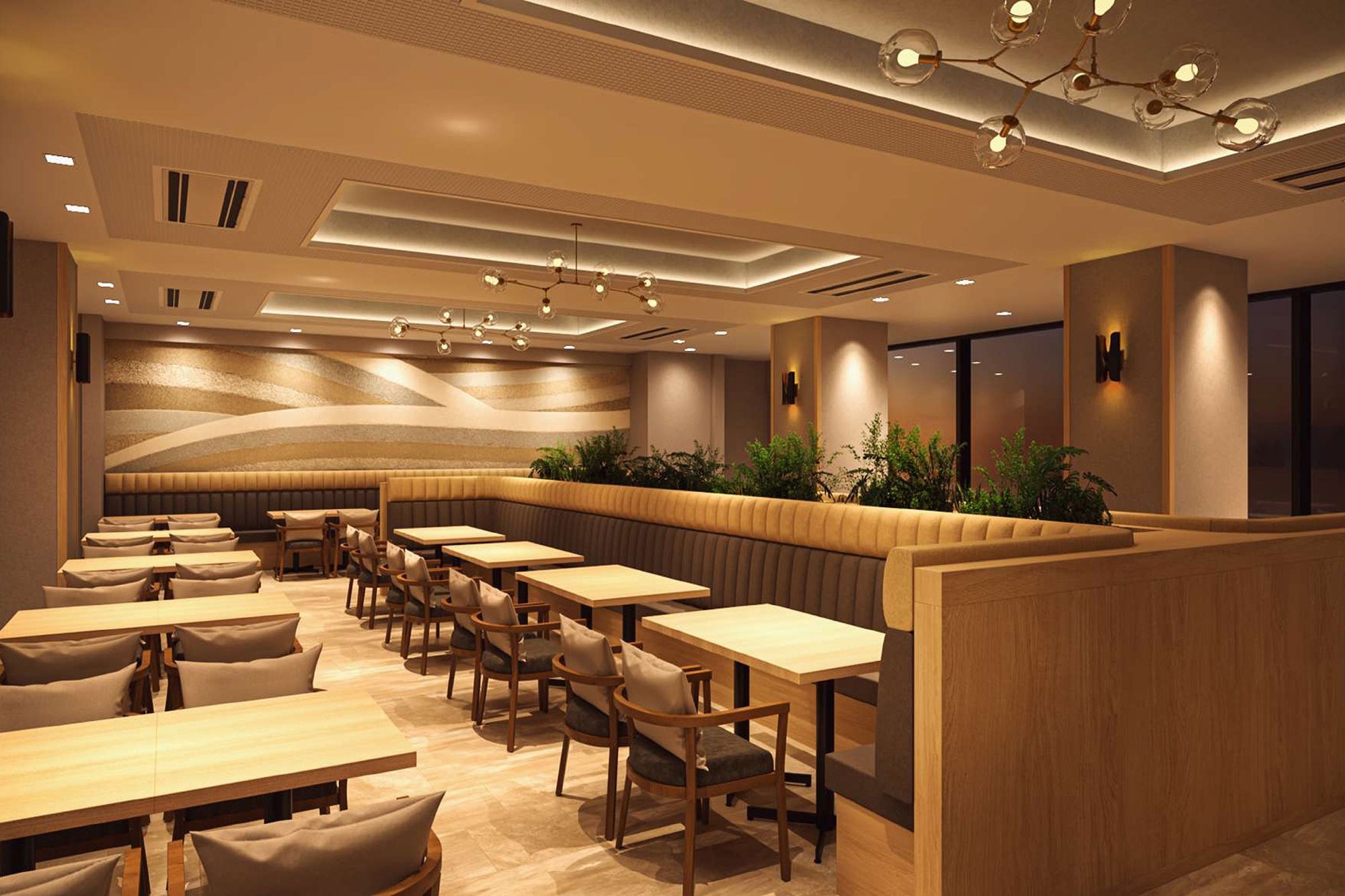 「ゆったりと、たおやかに。」お食事を楽しんでいただけるよう、各テーブルの間隔にゆとりを持たせ、今まで以上にゆったりと食事をお楽しみいただけるようにリニューアル。壁や床のトーン、また照明もシックでモダンな印象なものに変更し、ゆっくり食事を味わっていただける空間に生まれ変わります。また「オールインクルーシブ」を採用しているので、夕食時のアルコールはすべて飲み放題。岐阜県のお酒もご用意しております。