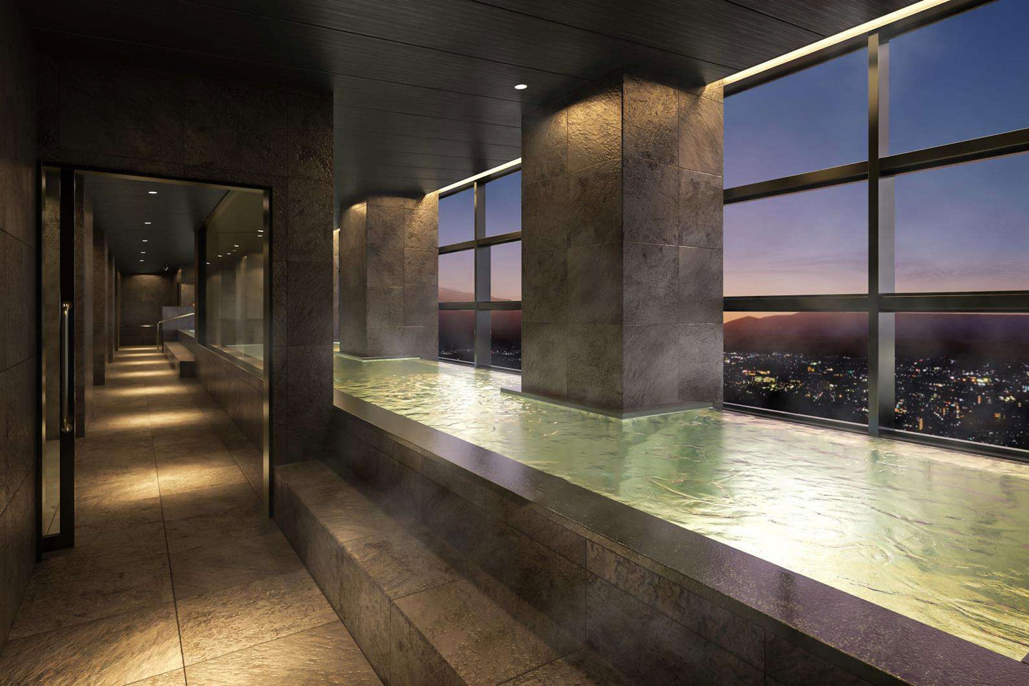 既存の大浴場とは別のフロアに、新たに大浴場と下呂の温泉街を一望できる絶景半露天風呂、サウナを新設いたします。半露天風呂からは南飛騨の雄大な自然と温泉街を一望することができます。また、内湯は一面ガラス張りになっているので、寒い日や暑い日は外に出なくても、素晴らしい景色をご堪能いただけます。浴場近くには湯上りラウンジも新設。お風呂上りもゆったりとおくつろぎいただけます。