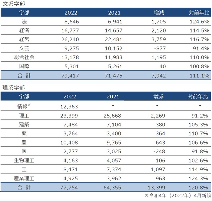 この結果について、株式会社大学通信 情報調査・編集部部長の井沢 秀氏は、「今年度は大学入学共通テストの難化が影響し、私立大学専願に切り替えた受験生や、併願先として私立大学を押さえておきたいと考える国公立大学志願者が増えたことで、一部の難関私立大学で志願者が増加傾向にあった。また、コロナ禍による経済状況の不透明さから、就職に結びつきやすい分野の学部で志願者が増加する動きが見られた。そのような状況のなか、近畿大学は、受験生に人気の高い情報学部を新設して過去最多の志願者数となった。昨年に続き、医学部・病院の感染症治療への貢献、全学的なコロナ対策支援プロジェクトなどの取り組みによって、社会に役立つ大学としての認識が一層高まったことも志願者獲得に繋がったと思われる」とコメントしています。