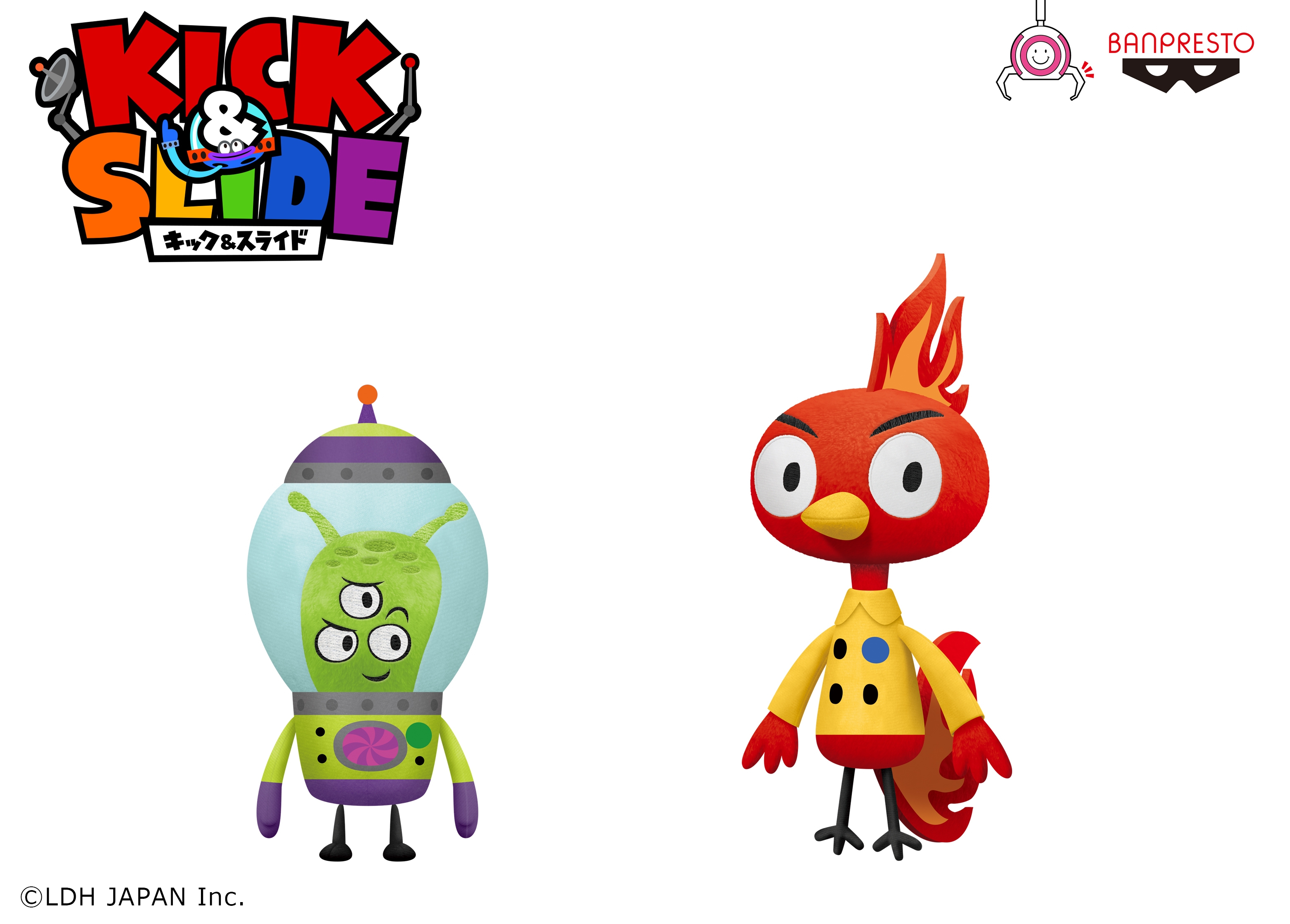 三代目J SOUL BROTHERSをデフォルメキャラクター化した キッズアニメ『KICK&SLIDE』が、ぬいぐるみになってプライズ初登場! アミューズメント施設でオリジナルシールがもらえる!