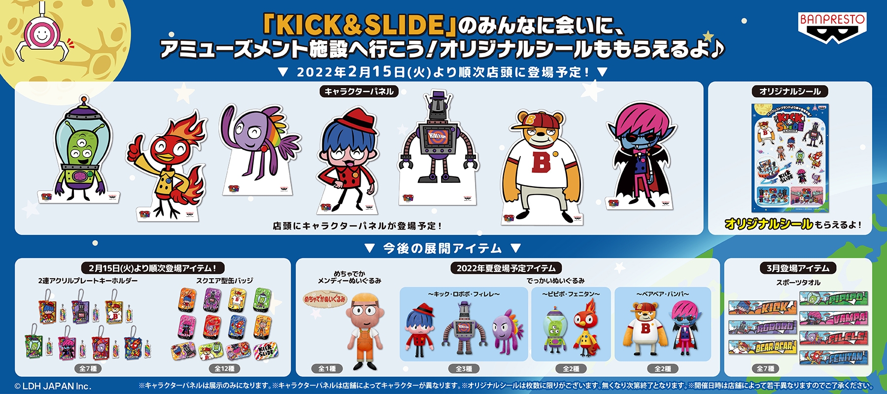 全国のアミューズメント施設で「「KICK&SLIDE」のみんなに会いに、アミューズメント施設へ行こう!オリジナルシールももらえるよ♪」を開催します。