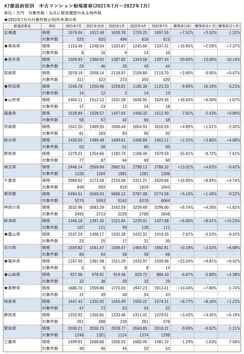 ■47都道府県 中古マンション相場推移(2021年7月~2022年7月)