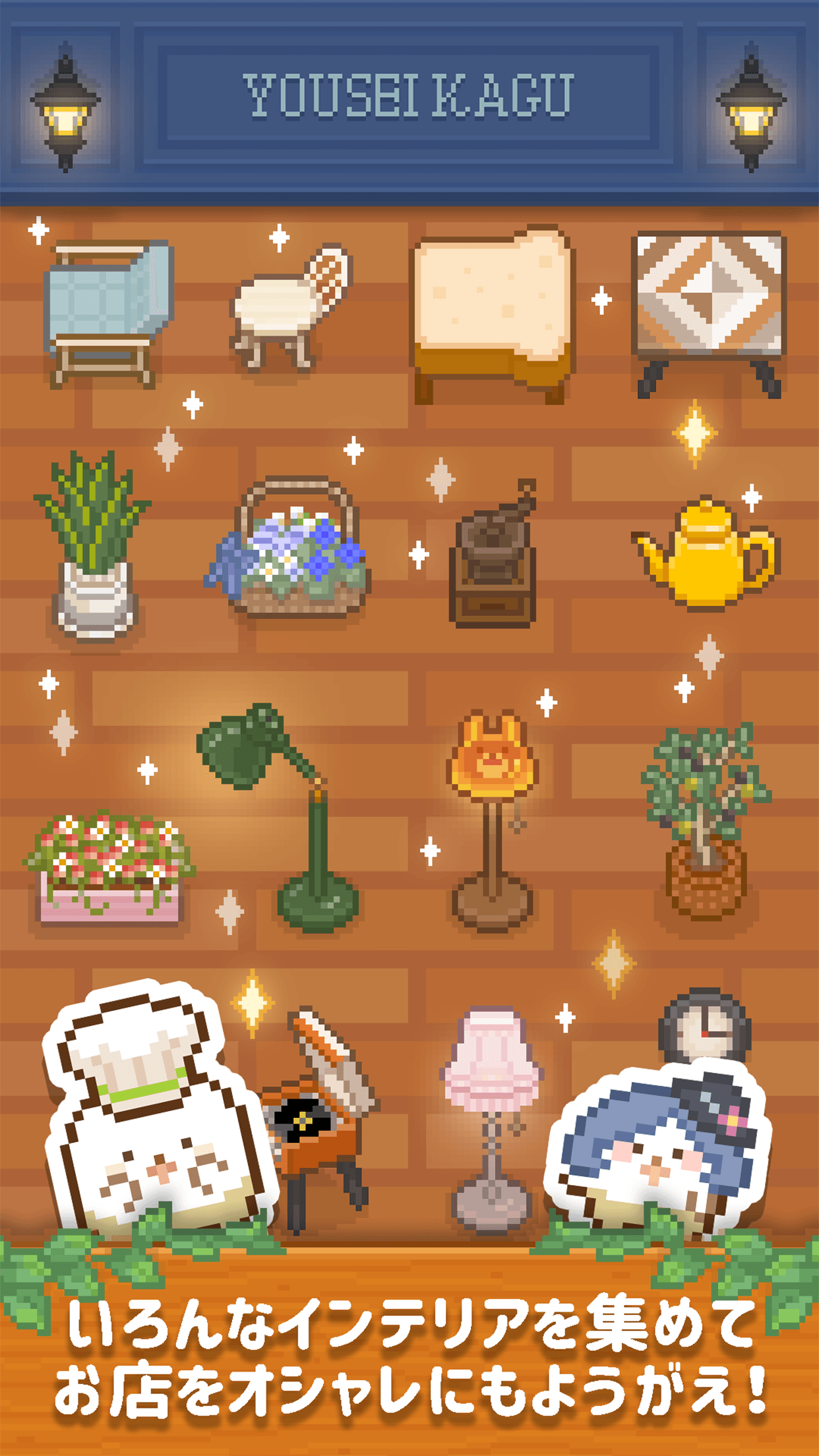 家具屋さんや福引き会場で、様々なインテリアを手に入れることができるよ。