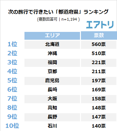 TOP3は、50票差をつけて1位となった「北海道(560票)」、TOP争い常連の「沖縄(510票)」が2位、3位は「福岡(221票)」となりました。TOP10を見ると“九州エリア”の人気も高く3県もランクインしている結果となりました。