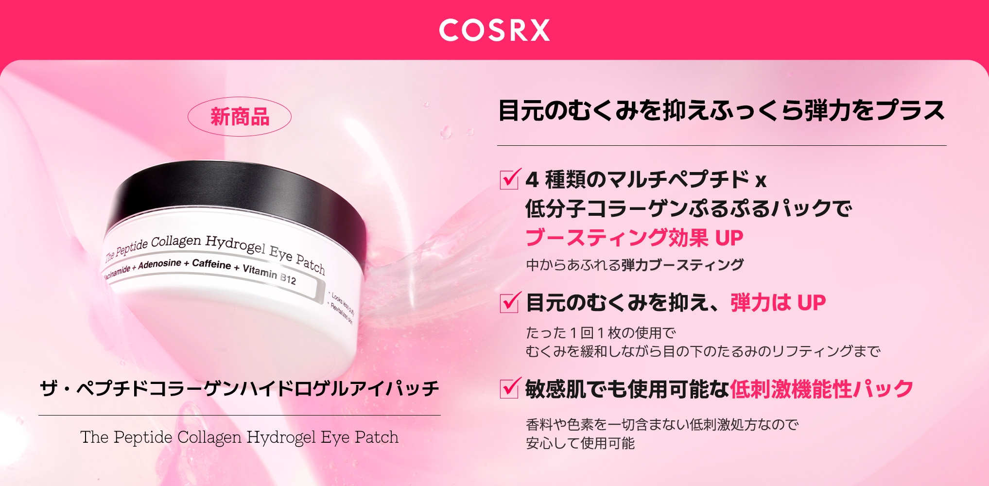 全世界に展開する韓国発のスキンケアブランド「COSRX」は肌に必要な成分を厳選し、敏感肌の方でも安心して使える製品開発を続ける信頼のブランドです。COSRXより「ボリュームと弾力ケア / 目元のむくみ軽減 / 表情ジワの改善 / 目元の明るさアップ」に効果的な新商品「RXザ・ペプチドコラーゲンハイドロゲルアイパッチ」を発売いたしました。冬の乾燥によるエイジングサインが気になる方におすすめの新商品です。