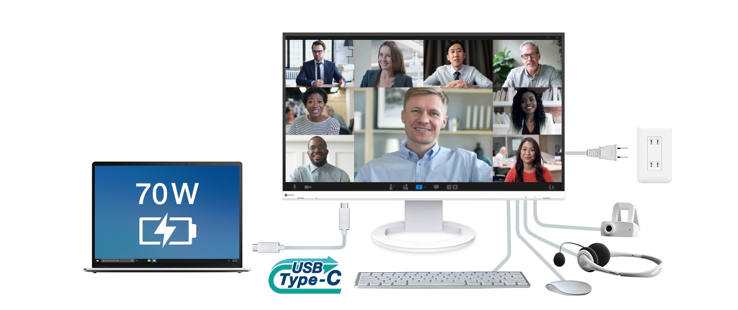 また、フリーアドレスやテレワーク、ハイブリッドワークなど、近年の多様化した働き方にマッチするUSB Type-C(R)入力端子を搭載。ノートPCとUSB Type-Cケーブル1本で接続するだけで、画面表示、音声再生、PCへの給電、USB機器接続を実現します。