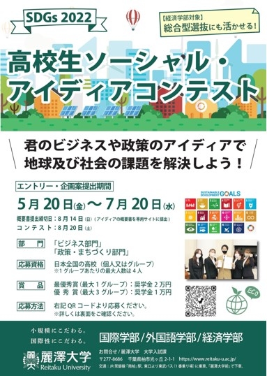 麗澤大学(千葉県柏市/学長:徳永澄憲)の経済学部は、2022年8月20日(土)に「SDGs2022 高校生ソーシャル・アイディアコンテスト」を開催します。これに伴い、SDGs(持続可能な開発目標)の考え方に沿ったビジネスや政策のアイディアを全国の高校生から公募します。本コンテストは2020年からはじまり、今年で3回目の開催です。