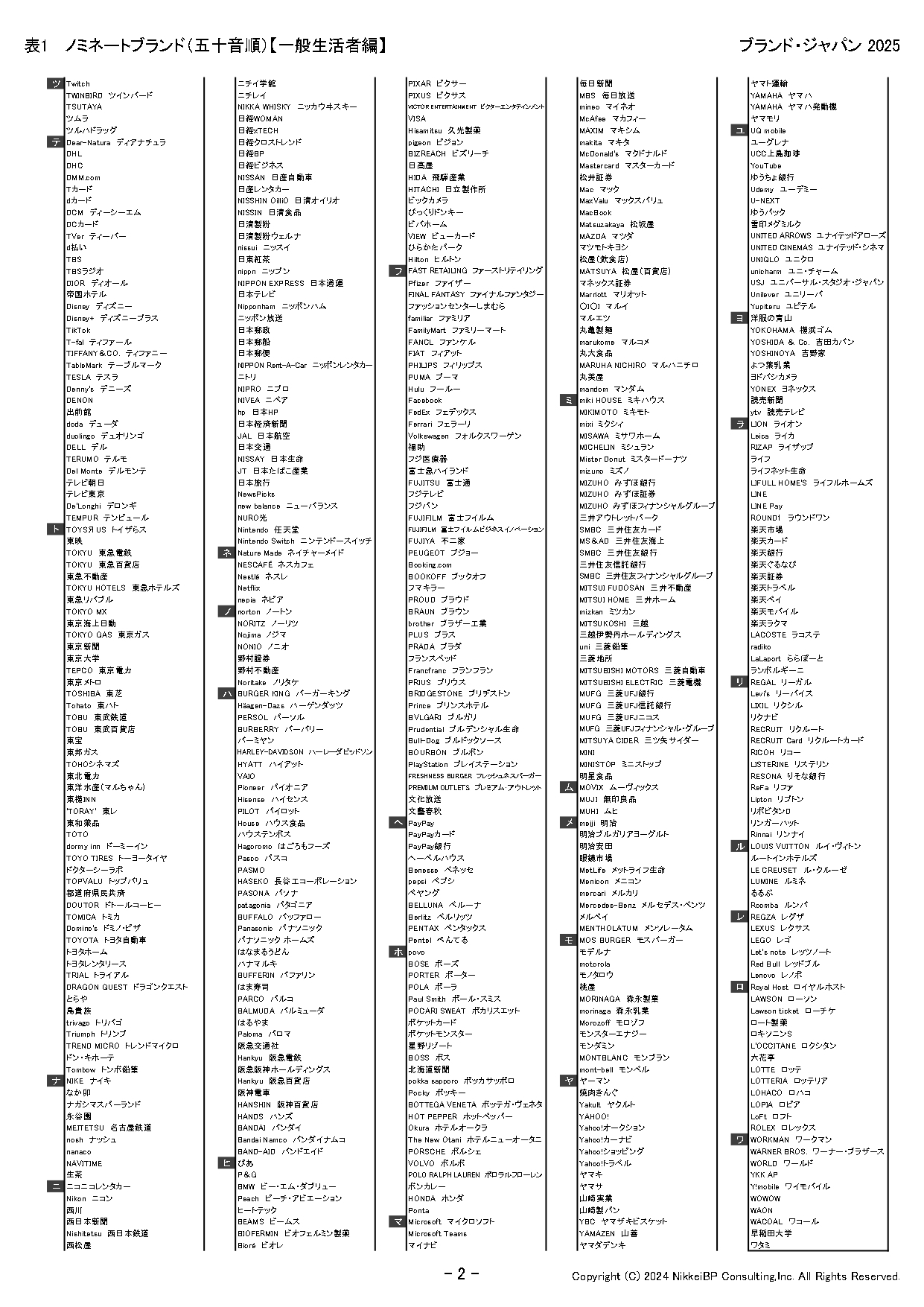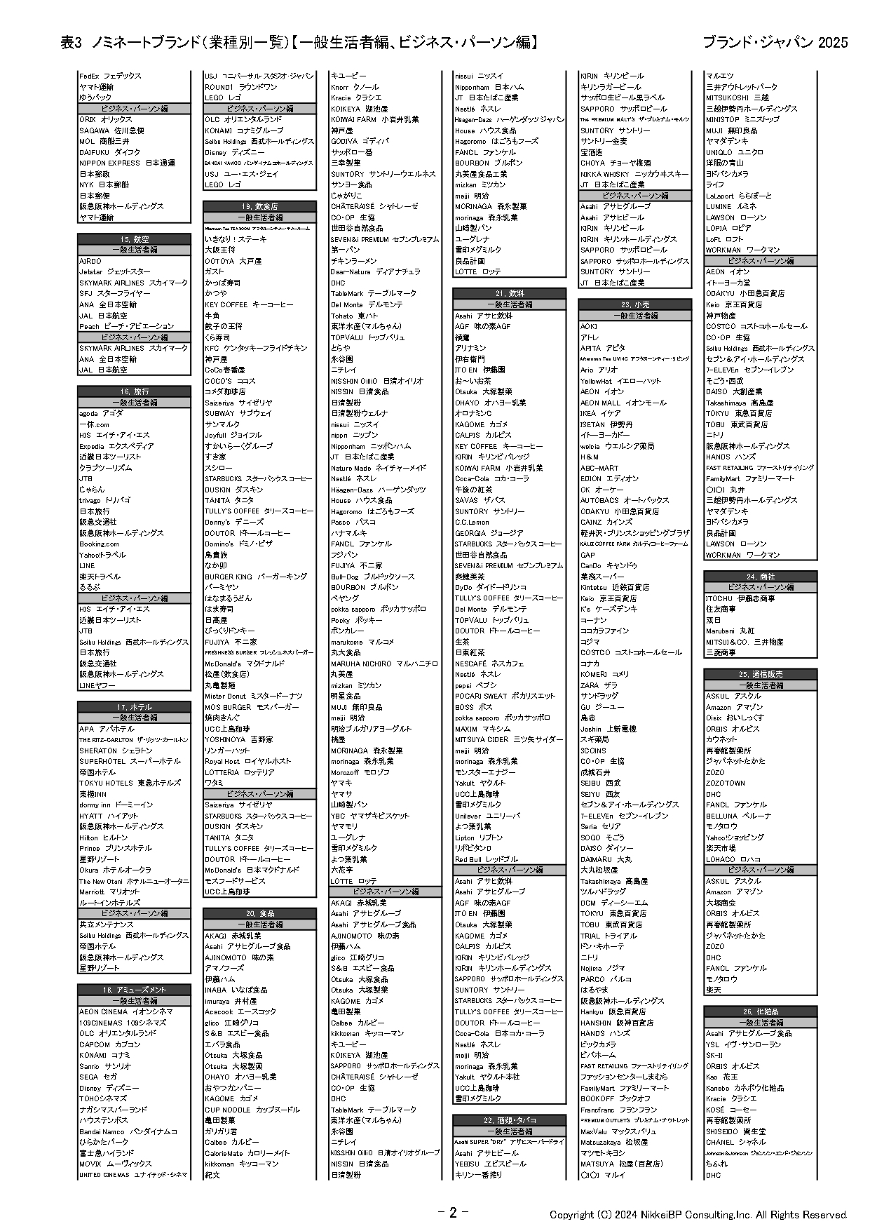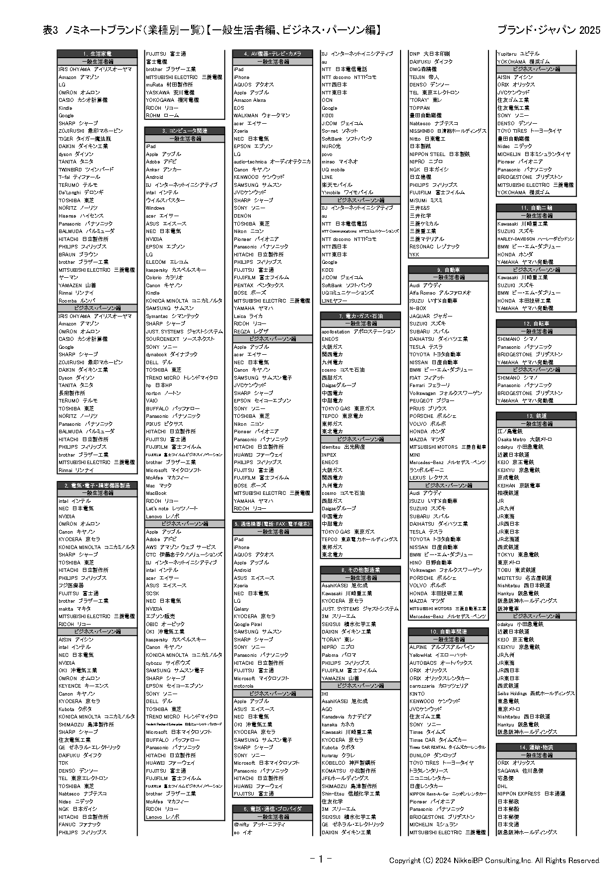 株式会社日経BPコンサルティング(東京都港区)は、2025年3月21日に発行予定の「ブランド・ジャパン2025」で調査対象となる1,500ブランド(一般生活者編1,000ブランド、ビジネス・パーソン編500ブランド)を発表した(表1~3)。
