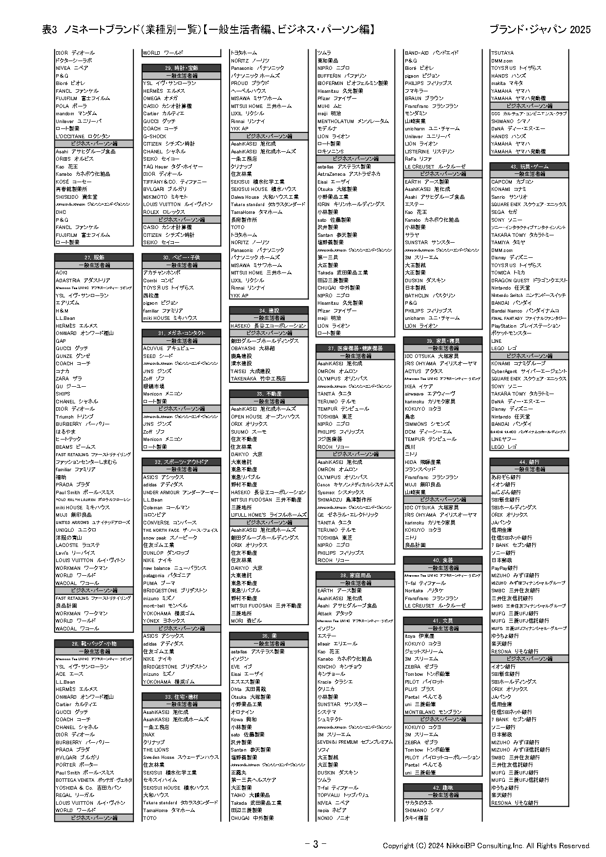 ※表3(別添):ノミネートブランド(業種別一覧)【一般生活者編、ビジネス・パーソン編】