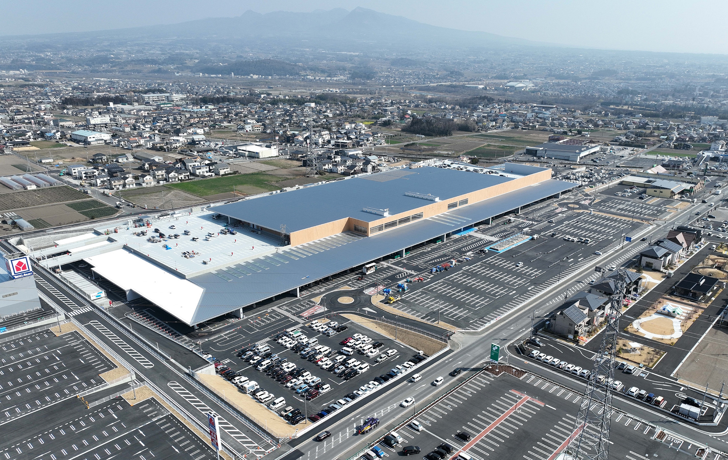 (1) 「ジョイホン吉岡店」の折板屋根と庇のほぼ全面に太陽光パネルを設置し、発電した電気を自店舗で使用する電気に組み込みます。