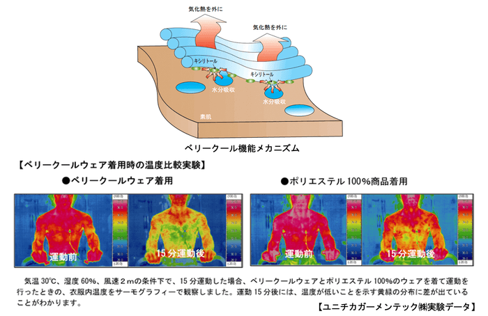 一部新商品ウェアにペットボトルを再利用した再生ポリエステル、オーガニックコットン(無農薬栽培綿)を繊維に使用。ベリークールの原料には、植物由来の白樺とトウモロコシを使用しております。